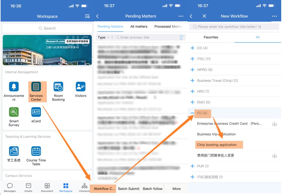 Go to Wecom Workspace → Workflow Center → FO → Business Trip Application/Ctrip Booking Application