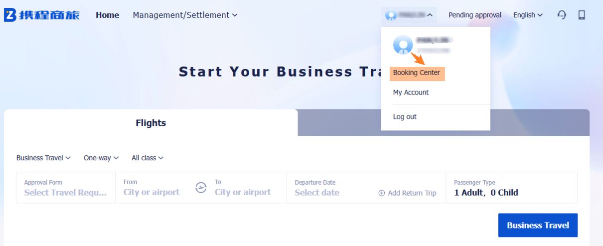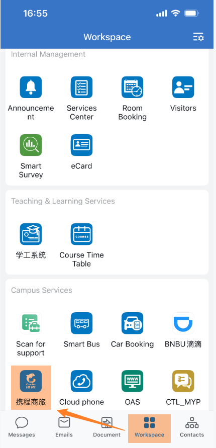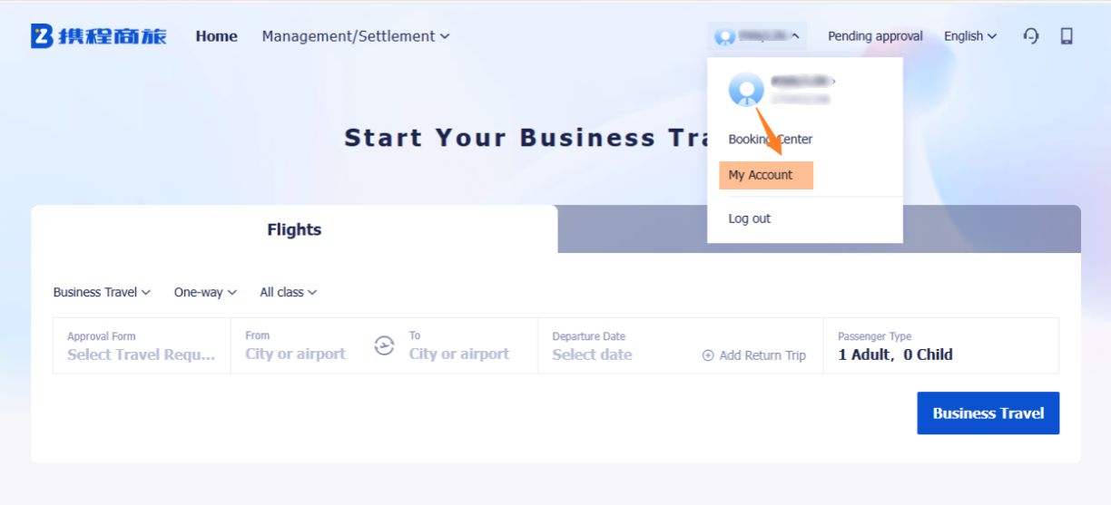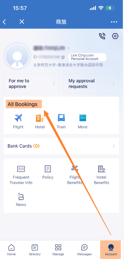 Or, Wecom App→Workspace→Ctrip Business Travel icon → [Account]