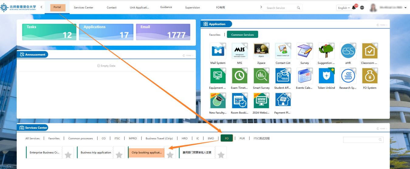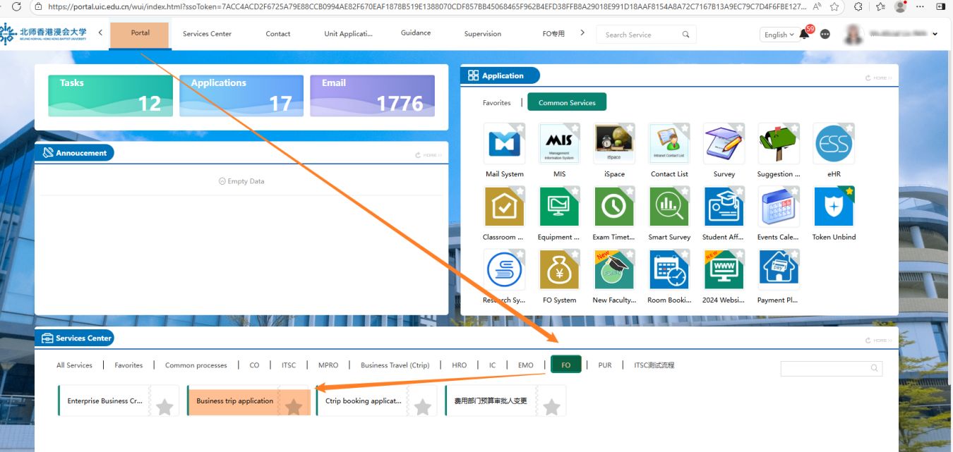 Log in to Portal → Services Center → FO → Business Trip Application Form/Ctrip Booking Application