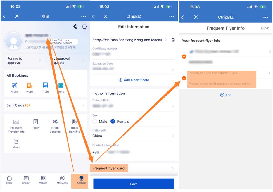 1)预订前在【个人信息】输入航司会员,提交订单时,勾选【常旅客卡】系统会自动识别该航司的会员号。