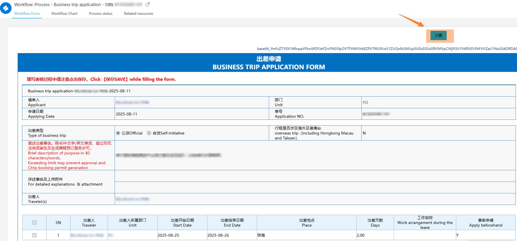 1)当出差申请表或携程预订服务申请表审批完成后,在Portal的Services Center或单据审批完成的通知邮件中打开出差申请表或携程预订服务申请表,点击最上方的【订票】按钮,即可跳转至携程订票界面。此时携程商旅会自动关联相应申请单。