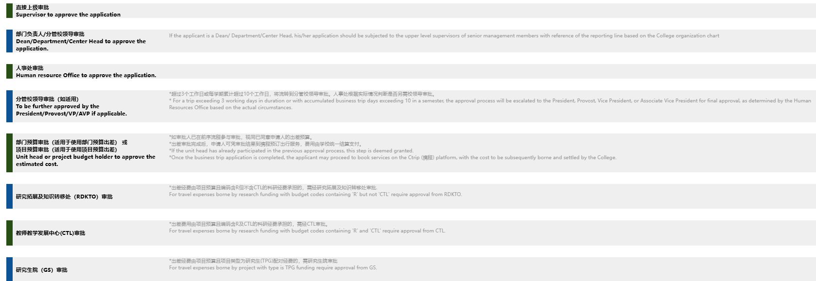 [Business Travel] is linked with the corresponding approved [Business Trip Application] or [Ctrip Booking Application] and of which the expenses incurred will be centrally settled by the Finance Office. For [Personal Travel] , no prior application is needed and the incurred expenses shall to be paid personally.
