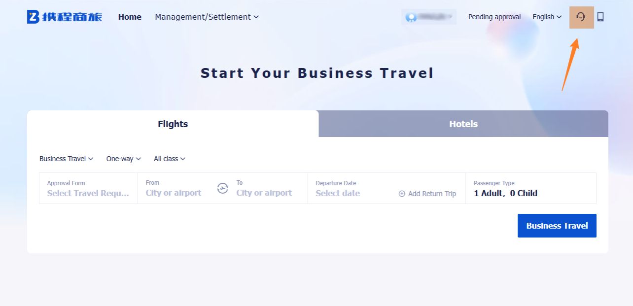 携程商旅网页端:点击携程商旅主页右上方的客服图标。