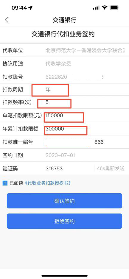 3.若付款人(即学生)没有开通交通银行手机银行或在银行预留手机号不正确,手机银行将无法收到代扣业务签约信息提醒。处理方案有两种: