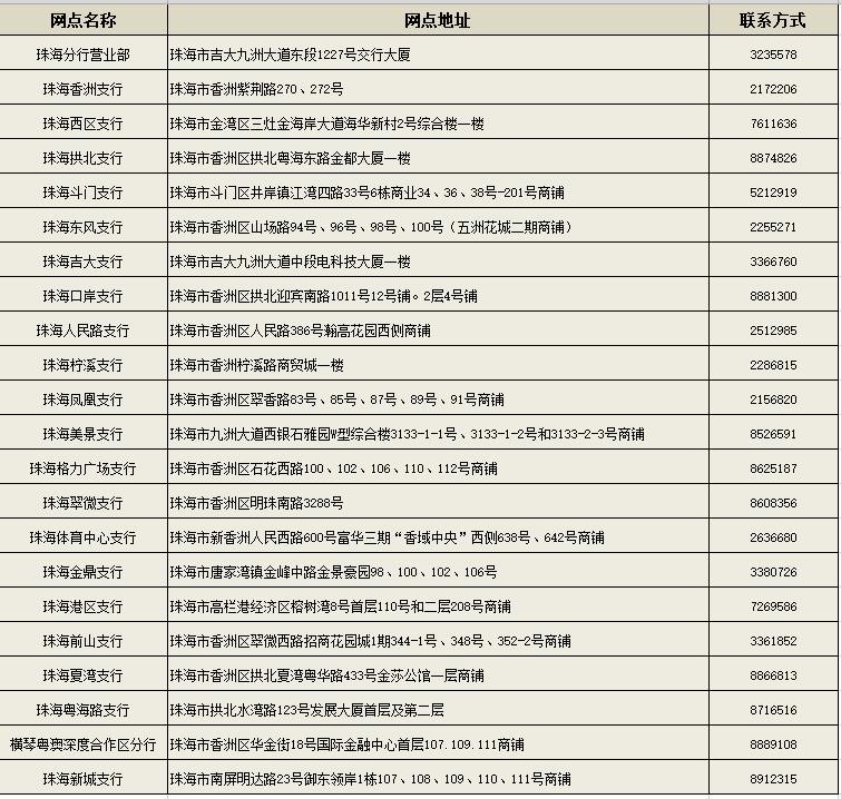 3.交通银行珠海分行各营业网点分布及联系方式: